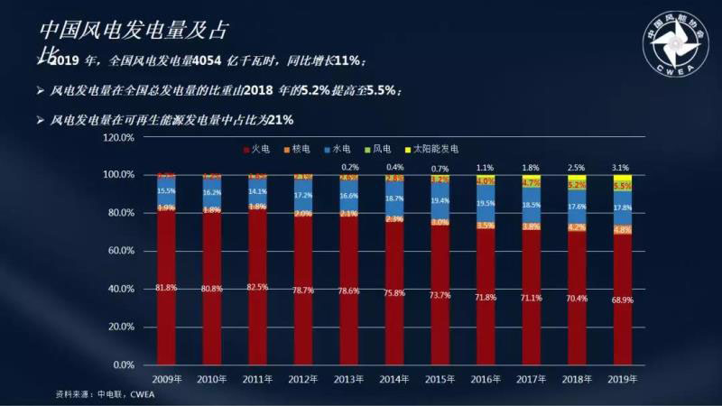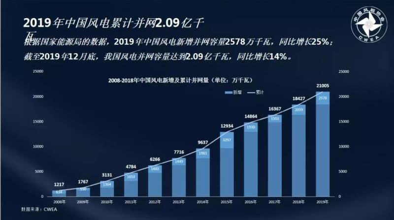 據(jù)秦海巖秘書長介紹,在風(fēng)電裝機(jī)量方面,2019年中國風(fēng)電新增裝機(jī)容量2578萬千瓦,同比增長25%,累計(jì)并網(wǎng)2.09億千瓦,同比增長14%。在風(fēng)電發(fā)電量方面,2019年全國風(fēng)電發(fā)電量達(dá)到4054億千瓦時(shí),同比增長11%,在全國總發(fā)電量的比重也從5.2%上升至5.5%。