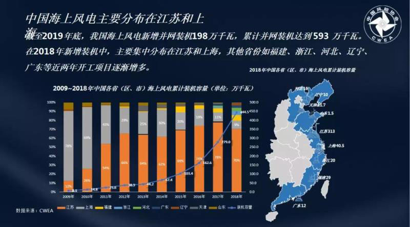同時(shí),風(fēng)電裝機(jī)結(jié)構(gòu)有了很大的變化,以往新增裝機(jī)數(shù)量較大的“三北”地區(qū)逐漸落后于中東南部地區(qū),2018年三北地區(qū)和中東南地區(qū)新增裝機(jī)數(shù)量占總裝機(jī)數(shù)量比率分別為43%和57%。東南沿海地區(qū)海上風(fēng)電的龍頭仍舊是江蘇(3.1GW)和上海(0.4GW),同時(shí),福建、浙江等省份也在逐漸增加海上風(fēng)電的裝機(jī)容量,未來廣東將成為潛力最大的海上風(fēng)電市場。