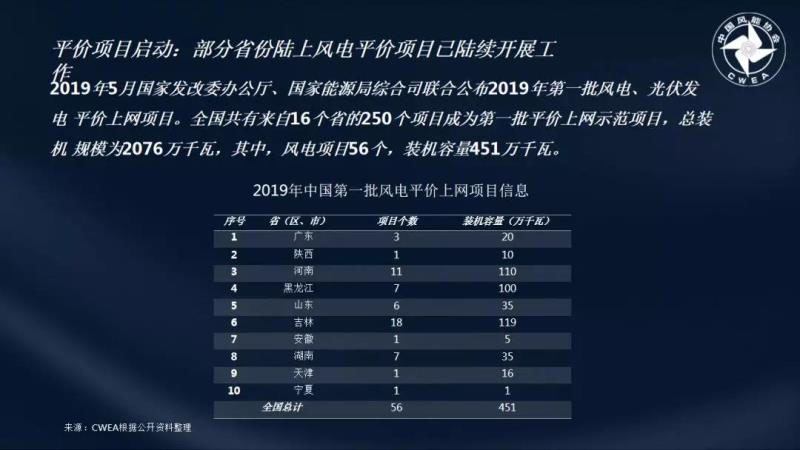 在2019年5月國家發(fā)改委辦公廳、國家能源局綜合司聯(lián)合公布2019年第一批風(fēng)電、光伏發(fā)電平價(jià)上網(wǎng)項(xiàng)目中,全國共有來自16個(gè)省的250個(gè)項(xiàng)目成為第一批平價(jià)上網(wǎng)示范項(xiàng)目,總裝機(jī)規(guī)模為2076萬千瓦,其中,風(fēng)電項(xiàng)目56個(gè),裝機(jī)容量451萬千瓦。