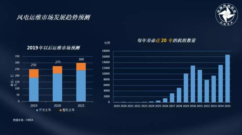 在未來,2020-2025年間的風(fēng)電市場將從已核準(zhǔn)搶電價(jià)、已核準(zhǔn)轉(zhuǎn)平價(jià)、平價(jià)基地等方面轉(zhuǎn)向平價(jià)項(xiàng)目、分散式風(fēng)電項(xiàng)目和換新項(xiàng)目。由于風(fēng)電機(jī)組的壽命普遍在20~25年,在2030年~2035年間,有大量的風(fēng)電機(jī)組需要換新。所以,在未來的風(fēng)電市場中,風(fēng)電運(yùn)維市場規(guī)模將不斷擴(kuò)大。根據(jù)預(yù)測,2035年,達(dá)到壽命上限的風(fēng)電機(jī)組容量將達(dá)到150GW,臺(tái)數(shù)將超過9萬臺(tái)。