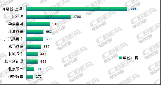 從車企排名看,前十車企的產(chǎn)量之和占本月新能源乘用車產(chǎn)量的87.5%。其中,特斯拉(上海)產(chǎn)量3898輛,占比份額超3成,高居榜首;比亞迪排名第二,產(chǎn)量1708輛,占比15.1%;華晨寶馬產(chǎn)量918輛,占比8.1%,排名第三;其他企業(yè)產(chǎn)量差距不大。