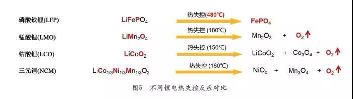 磷酸鐵鋰在熱失控后不會產(chǎn)生氧氣,而錳酸鋰、鈷酸鋰、三元鋰在熱失控后都會產(chǎn)生氧氣,因此,更容易起火。而磷酸鐵鋰熱失控所需要的溫度更高,相對而言,錳酸鋰、鈷酸鋰、三元鋰熱失控需要達(dá)到的溫度點都遠(yuǎn)低于磷酸鐵鋰(見圖5)。