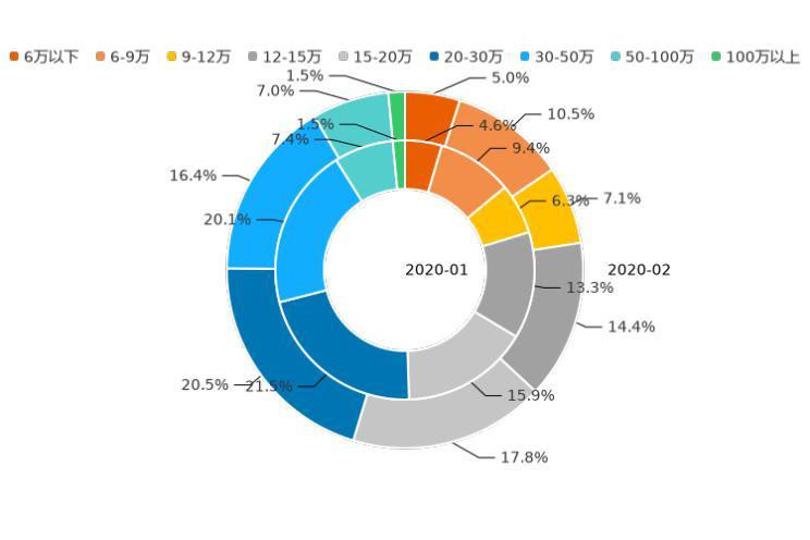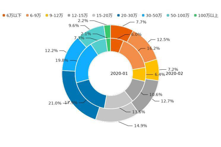 價格是用戶購車時最主要的考慮因素之一,那么用戶對不同價位車型的意向度究竟如何,一起來了解。今年2月,12萬以下價區(qū)用戶購車意向占比為21.7%,相較上月增加0.8個百分點(diǎn);12-20萬價區(qū)用戶購車意向占比達(dá)34.4%,對比上月上漲4.1%個百分點(diǎn);20-30萬價區(qū)用戶意向占比為21.1%,相較上月下滑0.2%;30-50萬價區(qū)用戶意向占比為13.3%,比上月降低4.7個百分點(diǎn);50萬以上價區(qū)用戶意向占比為9.5%,較上月上漲0.1%。
