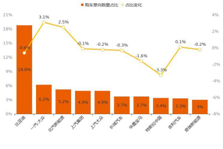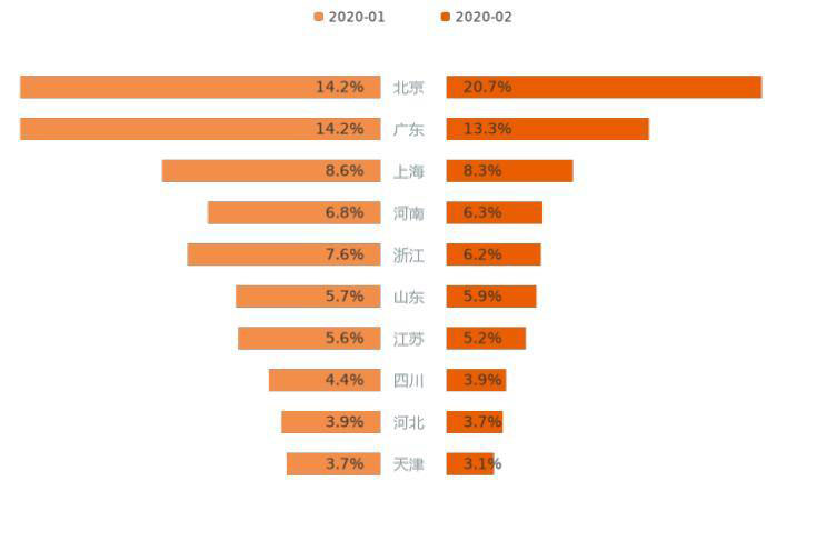 上述10個省份中,用戶意向占比有所增長的僅有2個,另外8個省份的意向占比出現(xiàn)不同程度下滑。其中,北京用戶意向增加6.5%,為意向占比增長較高的省份,山東增長0.2%;浙江減少1.4%,為下降最多省份。