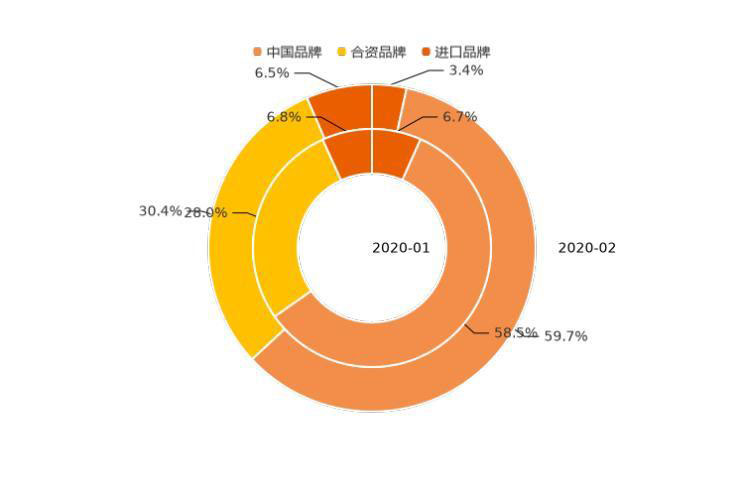 2月,中國品牌用戶購車意向占比相較上月,增加1.1個百分點(diǎn),達(dá)到59.7%,用戶熱度有所升溫。合資品牌用戶意向占比為30.4%,相對上月意向份額上升2.4%。進(jìn)口品牌份額從6.8%下降至6.5%。在華獨(dú)資車企(目前僅特斯拉)用戶購車意向從6.7%降至3.4%。