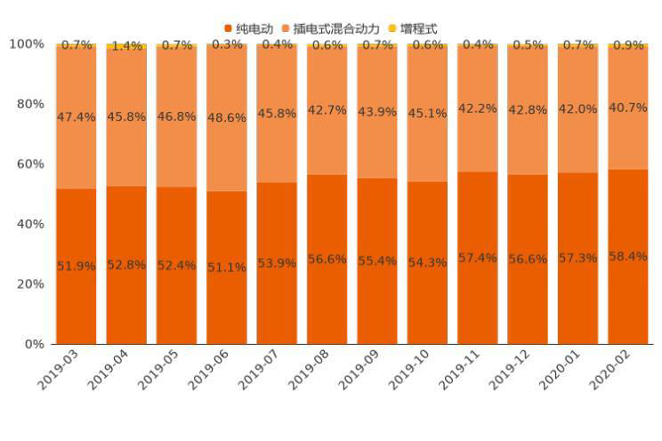 今年2月,新能源車中純電動車型用戶購車意向占比為58.4%,相較上月小幅上漲1.1個百分點(diǎn),購車意向占比持續(xù)提升;插電式混合動力車型購車意向占比為40.7%,與上月相比小幅下跌1.3個百分點(diǎn),購車意向占比持續(xù)下滑;增程式車型用戶意向占比僅為0.9%。整體來看,較長時間里,純電動車用戶意向長期高于50%的位置,且最近幾月呈上升態(tài)勢。這一定程度上反映了,經(jīng)過一段時間的引導(dǎo),用戶對純電動車的認(rèn)知度和接受度在提高。