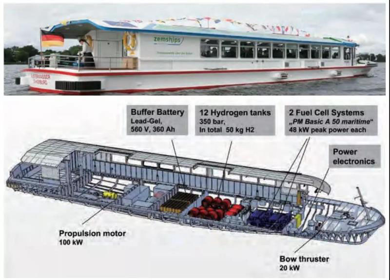 全球首個在商業(yè)客輪上使用燃料電池的項(xiàng)目ZEMSHIP項(xiàng)目起始中國船舶集團(tuán)605院500kW級內(nèi)河氫燃料電池動力貨船 于 2007年,由歐盟 EU-Life項(xiàng)目資金資助,其目的是為了在環(huán)境敏感區(qū)域使用零排放的船舶并進(jìn)行實(shí)際的測試,以推廣此技術(shù)在航運(yùn)界更廣泛的應(yīng)用。該船整合了兩個峰值功率 48kW的燃料電池和 560V的鉛蓄電池,船長為 25.5米,船寬 5.25米,可以運(yùn)送 100名乘客。該船于2008年 8月投入使用。