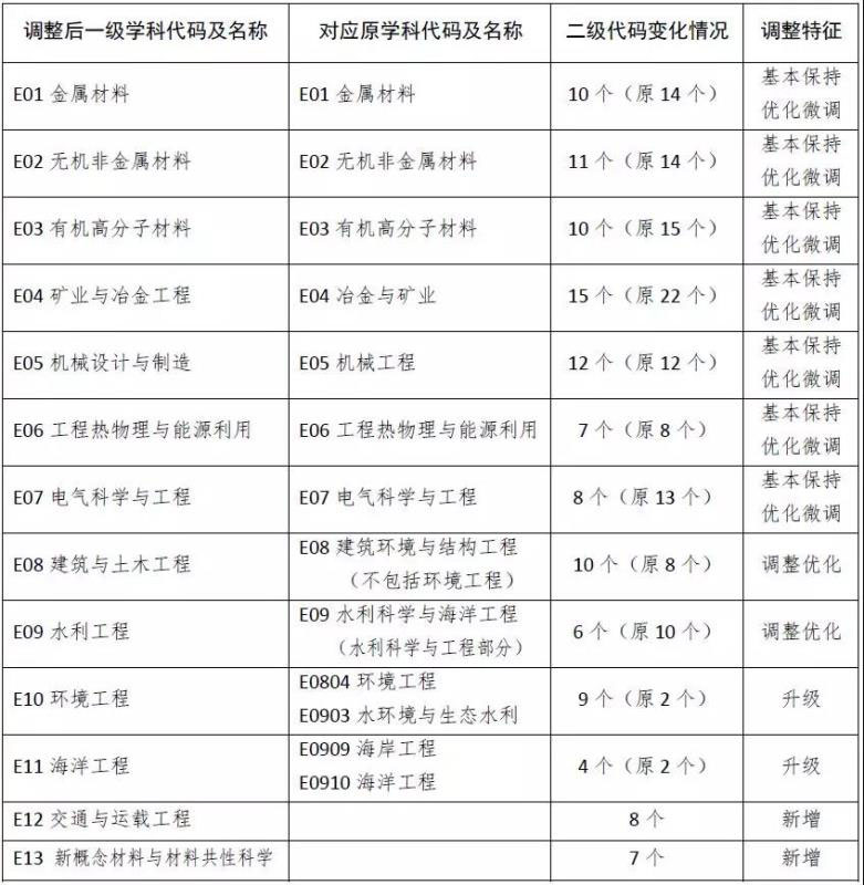 1. 一級學科由原來的9個調(diào)整為13個:新增2個一級學科,分別為交通與運載工程和新概念材料與材料共性科學;優(yōu)化升級出2個一級學科,分別為環(huán)境工程和海洋工程。