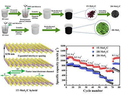 與石墨相比,具有二維/準二維晶體結(jié)構的材料由于具有相對安全的工作電壓,較大的比表面積、較為豐富的活性位點以及快速的離子/電子轉(zhuǎn)移能力,可被應用于鋰離子電池負極材料。作為二維材料的典型代表,MoS2具有類石墨烯層狀結(jié)構和高理論比容量(669 mAh/g)。然而,MoS2作為LIBs負極材料時存在如因材料導電性不好引起的倍率性能不佳、循環(huán)過程中因體積變化大引起穩(wěn)定性能差等不足。為解決上述問題,課題組對MoS2電極材料開展了改性研究,獲得了具有較優(yōu)越電化學性能的MoS2電極材料。