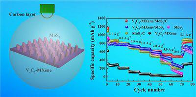 圖2. V4C3-MXene/MoS2/C復合材料的結(jié)構示意圖和倍率性能。