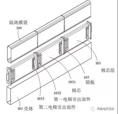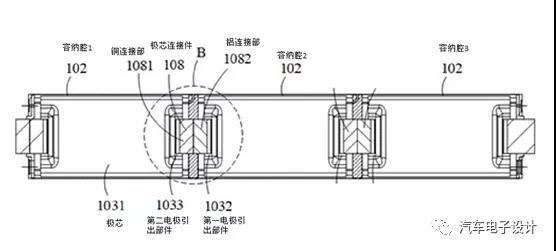 在串聯(lián)的方案下,兩個(gè)相鄰的極芯組之間設(shè)置有隔板,將電芯的空間分隔成若干個(gè)容納腔,這些容納腔形成類似的蜂巢結(jié)構(gòu),并且具備密封和注液通道。