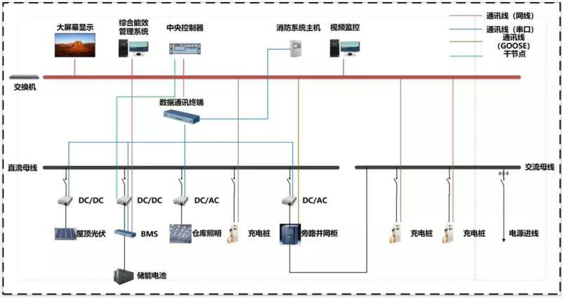 本項(xiàng)目將電力區(qū)域倉(cāng)庫(kù)園區(qū)的屋頂光伏發(fā)電系統(tǒng)、儲(chǔ)能系統(tǒng)、直流照明、電動(dòng)汽車(chē)快速充電裝置等四者結(jié)合起來(lái),構(gòu)成光儲(chǔ)充用一體化系統(tǒng)。系統(tǒng)可通過(guò)光伏、電網(wǎng)、儲(chǔ)能帶動(dòng)負(fù)載,多能互補(bǔ)、協(xié)同供應(yīng),滿足并網(wǎng)及離網(wǎng)模式下園區(qū)的正常供電使用,提高園區(qū)用電經(jīng)濟(jì)性及供電可靠性。