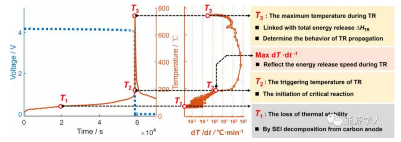 熱分析數(shù)據(jù)庫(kù)的建立促進(jìn)了對(duì)于電池?zé)崾Э囟x的共同認(rèn)識(shí)?;谠摂?shù)據(jù)庫(kù),歐陽(yáng)明高院士提出了商品化鋰離子電池?zé)崾Э剡^程中的三個(gè)特征溫度—T1、T2、 T3。其中,T1代表的是電池反常產(chǎn)熱的起始溫度,它能夠反映電池整體的安全性,通常是由負(fù)極材料的氧化還原反應(yīng)所造成的。T2是區(qū)分漸變式升溫與劇烈升溫的臨界點(diǎn),也被視為是電池?zé)崾Э氐囊l(fā)溫度。具有較高T2溫度的鋰離子電池通常更容易通過針刺等安全測(cè)試。T3是電池?zé)崾Э剡^程中能夠達(dá)到的最高溫度,常常與電池總體產(chǎn)熱呈正相關(guān)并決定著熱失控的程度。這三個(gè)熱失控過程中的特征溫度對(duì)于定義熱失所處階段和評(píng)估其影響提供了參考。