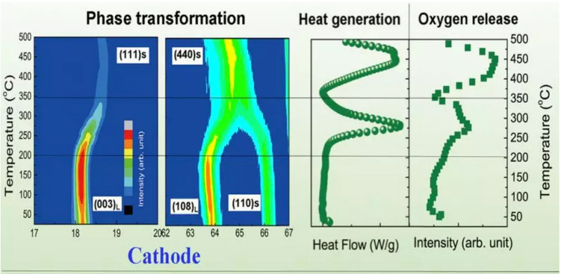 通常條件下,人們認(rèn)為鋰離子電池的熱失控是在濫用條件下由內(nèi)短路引發(fā)的,或者說至少熱失控過程會(huì)伴隨著隔膜收縮等問題引發(fā)的電池內(nèi)短路。然而,歐陽(yáng)明高院士最近的一篇Joule文章首次報(bào)道了電池在不發(fā)生內(nèi)短路的情況下仍然會(huì)發(fā)生嚴(yán)重的放熱。這是由于正負(fù)極化學(xué)交叉造成的:三元正極充電過程中發(fā)生相變釋氧,高氧化性的氣體與高還原性的鋰化負(fù)極發(fā)生反應(yīng)導(dǎo)致電池劇烈放熱從而發(fā)生熱失控。