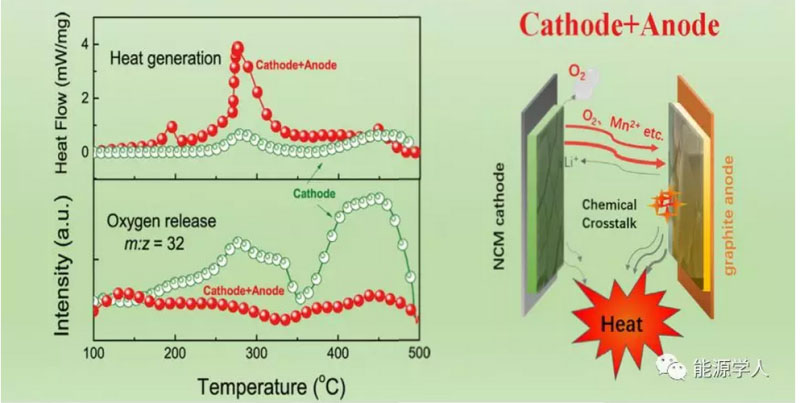 此外,在對(duì)特征溫度的對(duì)應(yīng)機(jī)理進(jìn)行研究過程中,他們發(fā)現(xiàn)商品化NCM/C鋰離子電池?zé)崾Э剡^程中主要的熱源來自于正負(fù)極在高溫下的氧化還原反應(yīng)而不是之前普遍認(rèn)為的電池內(nèi)短路。