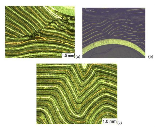 下圖為半徑為1”的擠壓球?qū)﹄姵卦斐傻慕Y(jié)構(gòu)破壞,電芯內(nèi)仍然有一條跨越多層電極的破壞線,活性物質(zhì)與集流體發(fā)生分離,集流體碎片沿著破壞線發(fā)生了滑移,進(jìn)入到了破壞線的內(nèi)部。