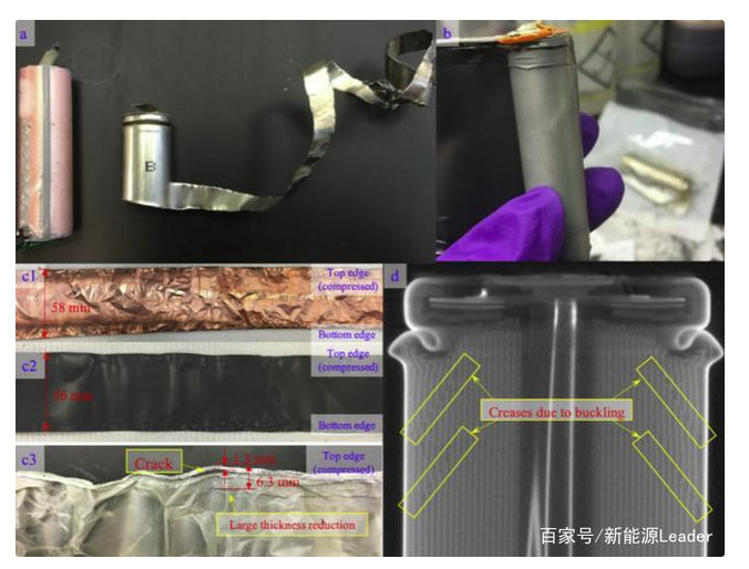 對試驗后的18650電池進行拆解顯示,雖然電芯發(fā)生了嚴重的變形,但是正負極并沒有發(fā)生斷裂,反而是隔膜在距離上部邊緣1.3mm的位置出現(xiàn)了一個裂縫,這直接導(dǎo)致了電池發(fā)生短路,電壓突降,而這一裂縫可能是由于金屬箔鋒利的邊緣侵入造成的。此外隔膜的在一些位置厚度出現(xiàn)了很大的下降,這主要是由于凹陷的外殼擠壓電芯造成的。