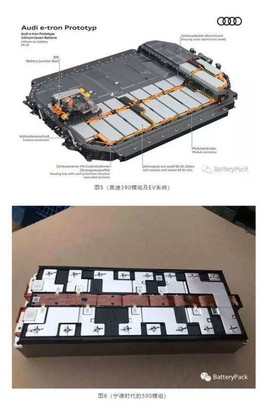 如圖4-圖9所示,390和590型號(hào)模組差別主要是單體電池的尺寸和制造工藝有差別。