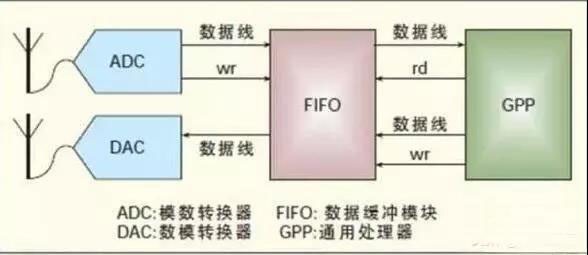 SDR(Software Defination Radio)即“軟件定義無線電”,是一種無線廣播通信技術(shù),更確切的說是一種設(shè)計方法或設(shè)計理念。具體而言,SDR是指基于軟件定義的無線通信協(xié)議而不是經(jīng)過專用硬件實現(xiàn)。目前存在3 種主流SDR 硬件平臺結(jié)構(gòu):基于GPP 的SDR 結(jié)構(gòu)、基于現(xiàn)場可編程門陣列(FPGA)的SDR(Non- GPP)結(jié)構(gòu)、基于GPP +FPGA/SDP 的混合SDR 結(jié)構(gòu)。其中基于GPP的SDR結(jié)構(gòu)如下: