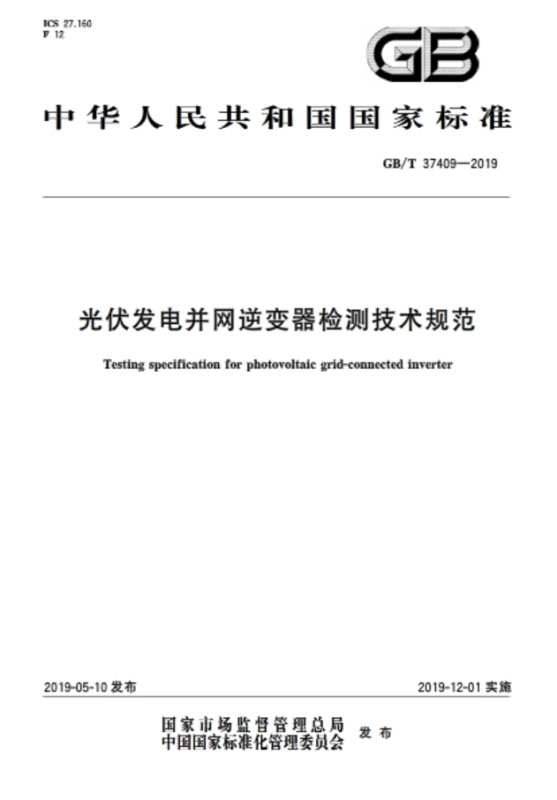 中國(guó)儲(chǔ)能網(wǎng)訊:日前,國(guó)家市場(chǎng)監(jiān)督管理總局、中國(guó)國(guó)家標(biāo)準(zhǔn)化管理委員會(huì)發(fā)布了光伏行業(yè)標(biāo)準(zhǔn)《光伏發(fā)電并網(wǎng)逆變器檢測(cè)技術(shù)規(guī)范》,標(biāo)準(zhǔn)號(hào):GB/T 37409-2019,該標(biāo)準(zhǔn)2019年12月1日開(kāi)始實(shí)施。
