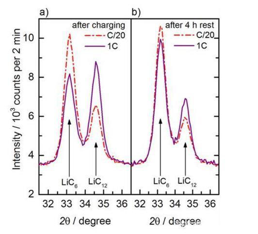 在充電結(jié)束后,電池需要靜置4h,對(duì)靜置后的電池在此進(jìn)行了中子衍射檢測(cè),具體結(jié)果如下圖所示,從曲線上可以看到,經(jīng)過(guò)4h的靜置后,LiC6的衍射峰強(qiáng)度明顯增強(qiáng),而LiC12的衍射峰的強(qiáng)度明顯下降,特別是1C倍率充電的電池這一變化更加顯著,這主要是受益于負(fù)極內(nèi)部各部分之間鋰濃度的“再平衡”。但是相比于C/20倍率充電的電池,1C倍率充電電池的LiC6的峰值要明顯低一些,這表明負(fù)極表面析出的鋰,一部分是不可逆的。