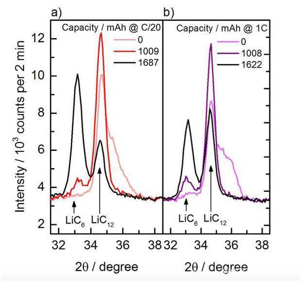 中子衍射的數(shù)據(jù)清楚地揭示了Li+嵌入到負(fù)極石墨結(jié)構(gòu)的過(guò)程,在C/20充電倍率下,首先Li+與石墨反應(yīng)生成LiC12,當(dāng)電池充電容量達(dá)到1009mAh(約50%SoC)時(shí),開(kāi)始出現(xiàn)LiC6的衍射峰,當(dāng)電池充電至1687mAh時(shí),LiC6衍射峰強(qiáng)度大大增加,超過(guò)LiC12的衍射峰強(qiáng)度。相比之下,在1C倍率下充電后,LiC6的衍射峰強(qiáng)度要低于LiC12的衍射峰,這表明Li+在石墨結(jié)構(gòu)中并不是100%轉(zhuǎn)化,只有一部分鋰嵌入到石墨的晶體結(jié)構(gòu)之中,另一部分鋰以金屬鋰的形式析出了,但是在衍射曲線上并未見(jiàn)到金屬鋰電衍射峰,這表明這部分析出的鋰數(shù)量比較少,無(wú)法通過(guò)中子衍射的手段檢測(cè)。