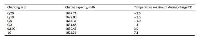 實(shí)驗(yàn)中Christian von Luders采用了18650電池,正極為NCM111材料,負(fù)極為石墨材料。在-2℃下C/20倍率下,電池受限于電解液擴(kuò)散條件和正負(fù)極活性物質(zhì)的動(dòng)力學(xué)條件的限制,僅能發(fā)揮出25℃下容量的87%左右,約1687.21mAh。下表是在-2℃下,不同倍率下的電池充電容量。從數(shù)據(jù)上我們可以注意到,隨著充電電流的增加,電池在充電過(guò)程中的溫度逐漸提高,這對(duì)電池低溫性能測(cè)量準(zhǔn)確性是有一定影響,但是受限于18650電池的熱傳導(dǎo)系數(shù),這一現(xiàn)象是難以避免的。