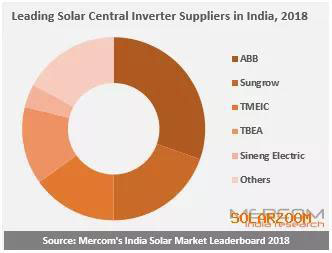 根據Mercom的調研,在印度市場,超過72%的逆變器供應是集中式逆變器,在這個領域,ABB、陽光電源、東芝三菱電機、特變電工和上能電氣分別是印度市場前五大中央逆變器供應商,占2018年供應的中央逆變器總量的83%。