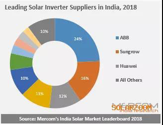 2019年6月,印度Mercom發(fā)布的印度2018年逆變器市場領導品牌榜單,Mercom稱,印度共有35家活躍的逆變器玩家,ABB以24%的市場份額占據排行榜首位,其次是陽光電源和華為,三者共計占領了印度市場52%,超過5GW的市場份額,前十大逆變器供應商則占據了超過94%的市場供應,其余6%由其他供應商共享。