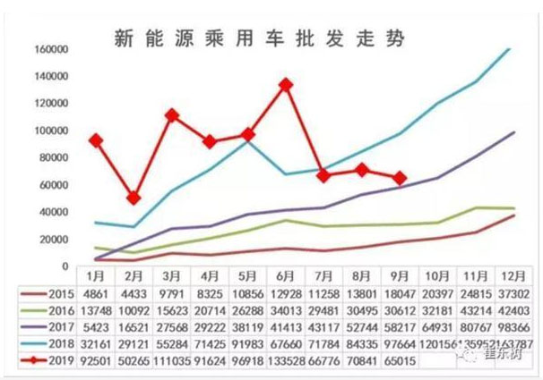 乘聯(lián)會(huì)數(shù)據(jù)顯示,2019年9月,新能源乘用車(chē)9月批發(fā)銷(xiāo)量為6.5萬(wàn)臺(tái),同比下降33.4%,環(huán)比8月下降8%。
