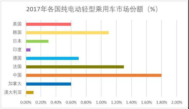 從全球電動(dòng)車市場(chǎng)來(lái)看,中國(guó)電動(dòng)車,特別是純電動(dòng)車的銷量和保有量均遙遙領(lǐng)先。國(guó)際能源署發(fā)布的全球電動(dòng)輕型乘用車保有量數(shù)據(jù)(圖1)顯示,中國(guó)純電動(dòng)車保有量在2014年后加速顯著,2017年同比增長(zhǎng)96.9%,占全球保有量的49.3%。中國(guó)電動(dòng)輕型乘用車銷售市場(chǎng)份額2017年達(dá)1.8%,領(lǐng)先于美國(guó)、德國(guó)、日本等主要發(fā)達(dá)國(guó)家(圖2)。