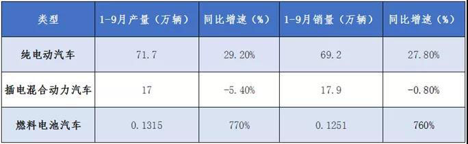 表1 1-9月國(guó)內(nèi)新能源汽車產(chǎn)銷量
