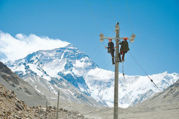 2014年4月12日16時,隨著一條10千伏供電線路合閘送電,海拔5200米的珠穆朗瑪峰大本營正式通電。國家電網(wǎng)通過大電網(wǎng)延伸方式,點亮了世界海拔最高的地方。