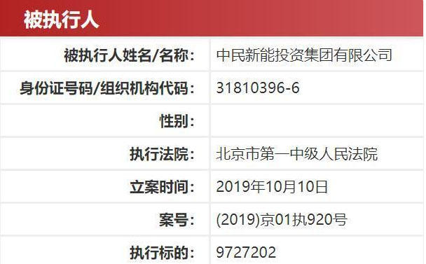 新京報記者自全國法院執(zhí)行信息平臺獲悉,中民新能投資集團(tuán)有限公司已經(jīng)在近日被北京市第一中級人民法院列為被執(zhí)行人,案號(2019)京01執(zhí)920號,立案時間2019年10月10日,執(zhí)行標(biāo)的“9727202”。