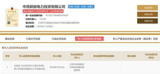 近日,新京報記者發(fā)現(xiàn),中民新能電力投資有限公司因“未依照《企業(yè)信息公示暫行條例》第八條規(guī)定的期限公示年度報告”,已經(jīng)于2018年7月被天津市濱海新區(qū)市場和質(zhì)量監(jiān)督管理局列入經(jīng)營異常名錄。