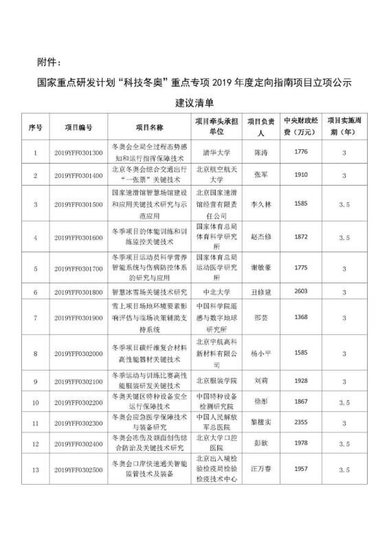 中國(guó)儲(chǔ)能網(wǎng)訊:根據(jù)《國(guó)務(wù)院關(guān)于改進(jìn)加強(qiáng)中央財(cái)政科研項(xiàng)目和資金管理的若干意見(jiàn)》(國(guó)發(fā)[2014]11號(hào))、《國(guó)務(wù)院關(guān)于深化中央財(cái)政科技計(jì)劃(專項(xiàng)、基金等)管理改革方案的通知》(國(guó)發(fā)[2014]64號(hào))、《科技部、財(cái)政部關(guān)于印發(fā)<國(guó)家重點(diǎn)研發(fā)計(jì)劃管理暫行辦法>的通知》(國(guó)科發(fā)資[2017]152號(hào))等文件要求,現(xiàn)對(duì)“科技冬奧”重點(diǎn)專項(xiàng)2019年度定向指南擬立項(xiàng)的項(xiàng)目信息進(jìn)行公示(詳見(jiàn)附件)。