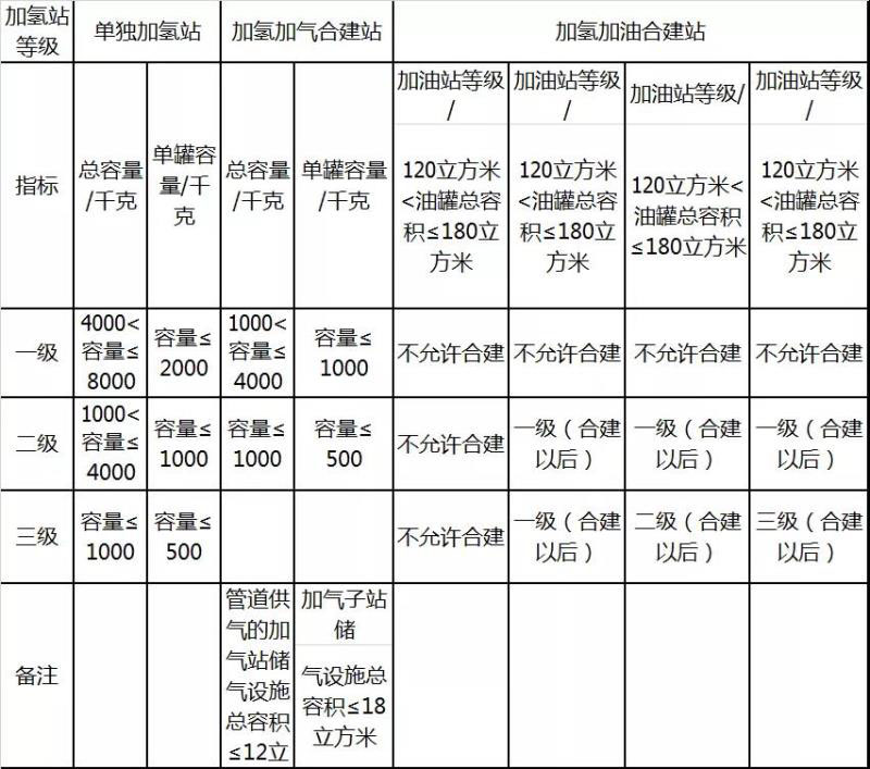 注:資料來(lái)源自《加氫站技術(shù)規(guī)范(國(guó)標(biāo)GB50516-2010)》;對(duì)于加氫加氣合建站:管道供氣的加氣站儲(chǔ)氣設(shè)施總?cè)莘e是各個(gè)儲(chǔ)氣設(shè)施的結(jié)構(gòu)容積或水容積之和;對(duì)于加氫加油合建站:柴油罐容量可折半計(jì)入油罐總?cè)莘e;“不允許合建”表示對(duì)應(yīng)等級(jí)的加氫站和加油站不得建設(shè)為加氫加油合建站。