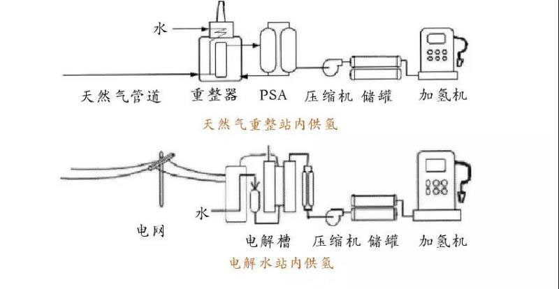 內(nèi)制氫加氫站內(nèi)建有制氫系統(tǒng),制氫技術(shù)包括電解水制氫、天然氣重整制氫、可再生能源制氫等,站內(nèi)制備的氫氣一般需經(jīng)純化、干燥后再進(jìn)行壓縮、存儲(chǔ)及加注等步驟。其中,電解水制氫和天然氣重整制氫技術(shù)由于設(shè)備便于安裝、自動(dòng)化程度較高,且天然氣重整技術(shù)可依托天然氣基礎(chǔ)設(shè)施建設(shè)發(fā)展,因而在站內(nèi)制氫加氫站中應(yīng)用最多,歐洲內(nèi)制氫加氫站主要采用這兩種制氫方式。