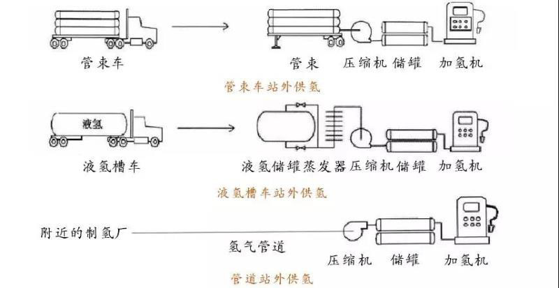 外供氫加氫站內(nèi)無(wú)制氫裝置,氫氣通過(guò)長(zhǎng)管拖車、液氫槽車或者氫氣管道由制氫廠運(yùn)輸至加氫站,由壓縮機(jī)壓縮并輸送入高壓儲(chǔ)氫瓶?jī)?nèi)存儲(chǔ),最終通過(guò)氫氣加氣機(jī)加注到燃料電池汽車中使用。