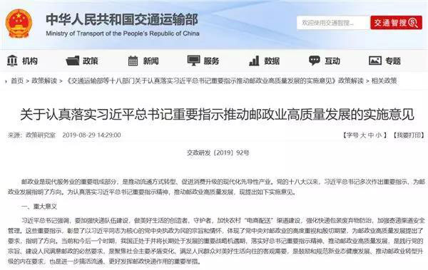近日,交通運輸部、國家郵政局等18個部門聯(lián)合印發(fā)《關(guān)于認真落實習(xí)近平總書記重要指示推動郵政業(yè)高質(zhì)量發(fā)展的實施意見》(簡稱《意見》)?!兑庖姟妨⒆惝斍?,著眼長遠,從全面深化改革、強化創(chuàng)新驅(qū)動、加快結(jié)構(gòu)調(diào)整、提高服務(wù)質(zhì)量、推動綠色發(fā)展、加強隊伍建設(shè)六個方面提出了18項重點任務(wù)。