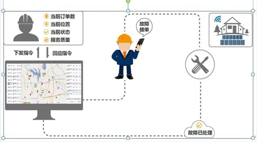 運(yùn)維方面,從成本角度考慮,村級(jí)扶貧電站不適合派人長期駐守運(yùn)維, 故障的及時(shí)發(fā)現(xiàn)、分析、解決需要制定靈活高效的運(yùn)維方案。光伏行業(yè)先進(jìn)企業(yè)通過現(xiàn)代化物聯(lián)網(wǎng)技術(shù)、人工智能及大數(shù)據(jù)分析技術(shù),為光伏電站打造智慧大腦,實(shí)現(xiàn)電站實(shí)時(shí)監(jiān)測(cè)、智能分析和診斷、快速定位。此次示例設(shè)計(jì)方案中將電站接入智慧能源扶貧平臺(tái),在實(shí)現(xiàn)以上功能基礎(chǔ)之外,增加智能派單功能,實(shí)現(xiàn)及時(shí)消缺,使得村級(jí)扶貧電站的運(yùn)維更加高效。