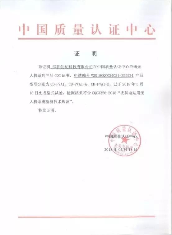 在中國質量認證中心的牽頭下,創(chuàng)動科技參與了《光伏電站用無人機系統(tǒng)檢測技術規(guī)范》的編寫。5月18日創(chuàng)動智能光伏運維無人機通過了產品型式試驗及工廠審查等多個認證規(guī)則的要求,于6月15日獲得中國質量認證中心CQC光伏電站用無人機認證證書,這也是全國首家獲得該證書的無人機生產企業(yè)。