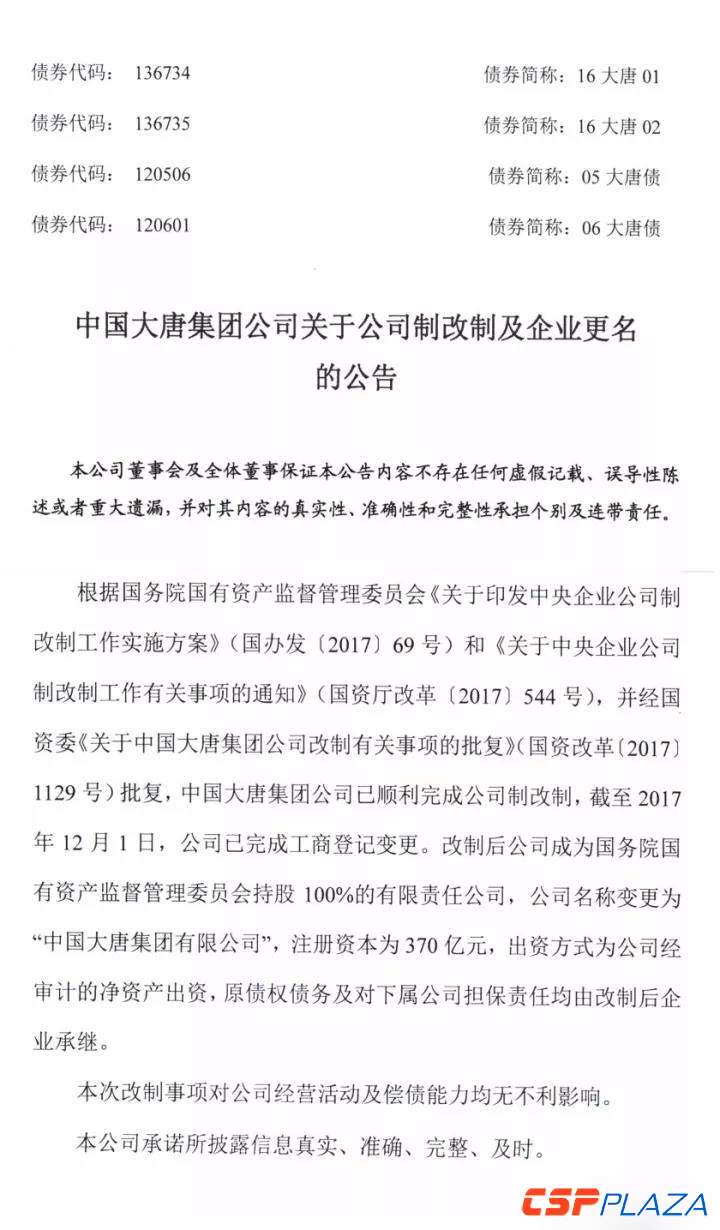 中國儲能網訊:近日,大唐集團發(fā)布了關于公司制改制及企業(yè)更名的公告。公告顯示,中國大唐集團公司已順利完成公司制改制,截至2017年12月1日,公司已完成工商登記變更。改制后公司成為國務院國資委持股100%的有限責任公司,公司名稱變更為“中國大唐集團有限公司”,注冊資本為370億元。