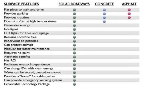 光伏發(fā)電路面設(shè)想在 2006 年由美國的一對科學(xué)家夫婦提出并開始研究。布魯索夫婦發(fā)明出一種正六邊形的太陽能電池板(SolarRoadway),其表面是一種超耐磨的特殊玻璃,承重最高達(dá) 125 噸,能保證汽車的安全行駛。Solarroadways 官網(wǎng)對 Solarroadway、混凝土、瀝青三種不同路面材料做了對比。