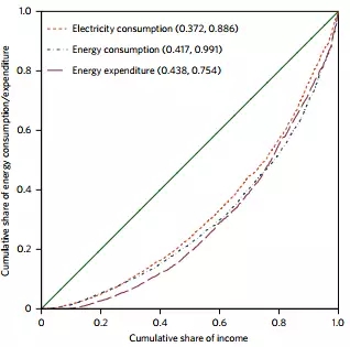 能源的洛倫茲曲線,X軸表示的是家庭收入的累積百分比,Y軸表示能源消耗的的累積百分比。括號(hào)中的兩組數(shù)據(jù)分別是基尼系數(shù)和洛倫茲不對(duì)稱(chēng)系數(shù)。