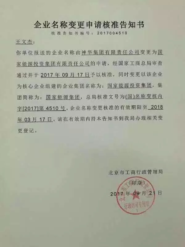 “神華集團(tuán)有限責(zé)任公司”于9月17日被核準(zhǔn)變更為“國家能源投資集團(tuán)有限責(zé)任公司”;核心企業(yè)組建的企業(yè)集團(tuán)名稱變更為“國家能源投資集團(tuán)”;集團(tuán)簡稱為“國家能源集團(tuán)”。