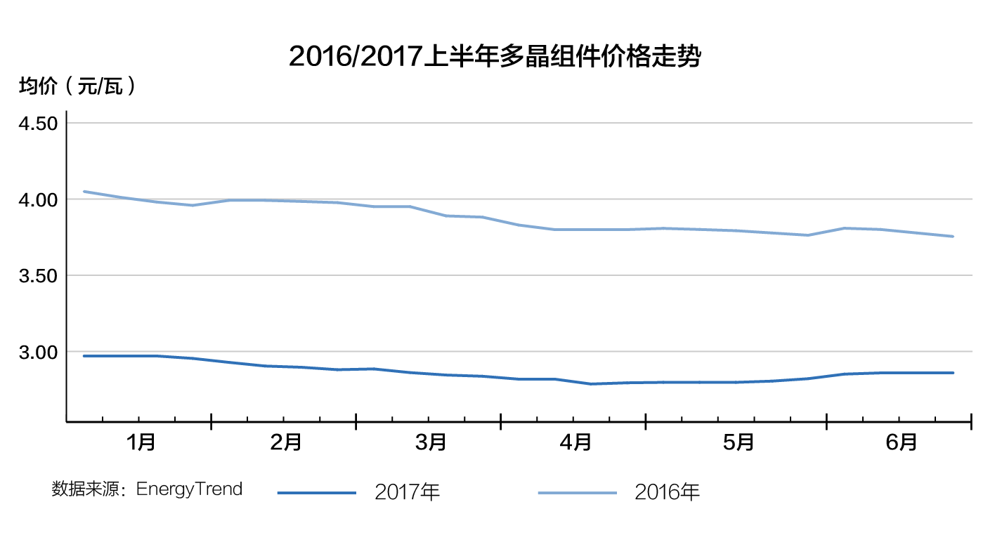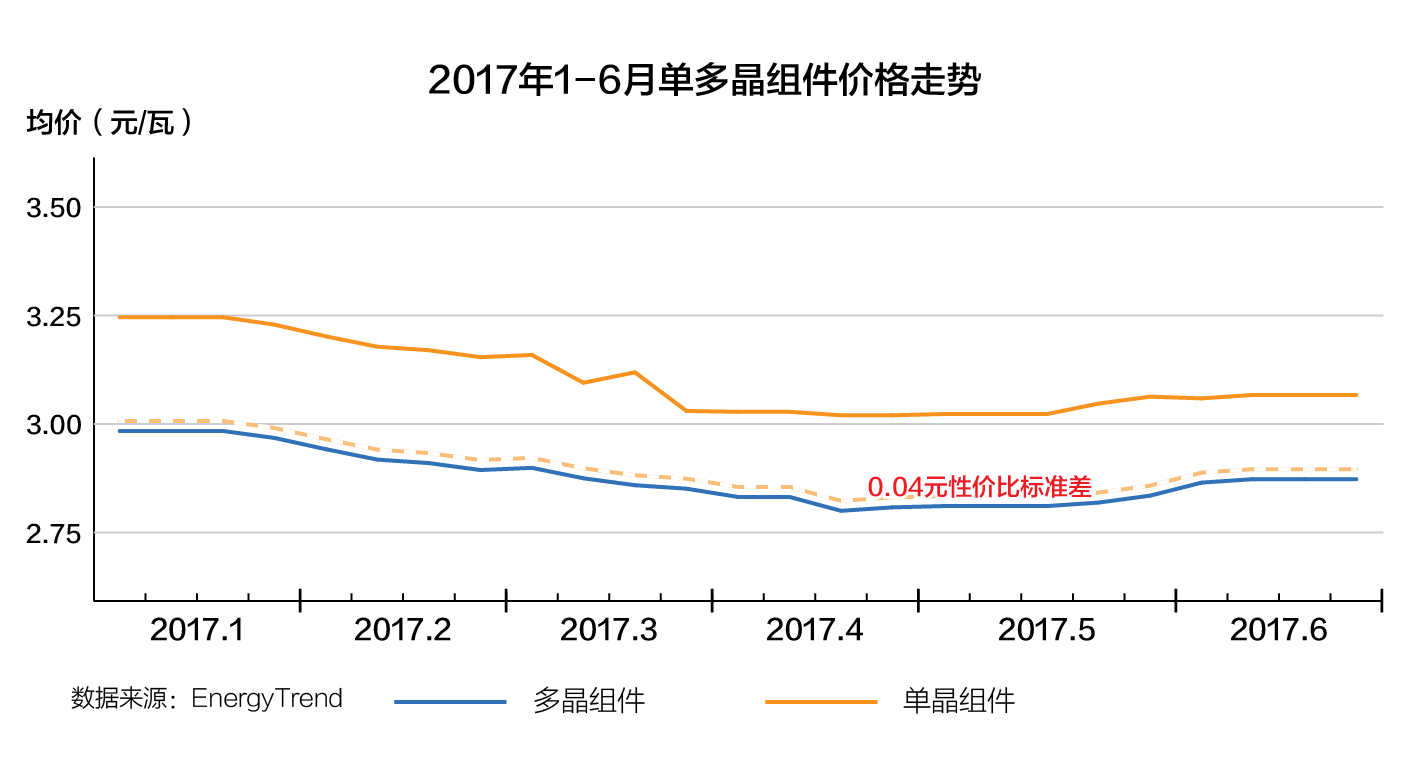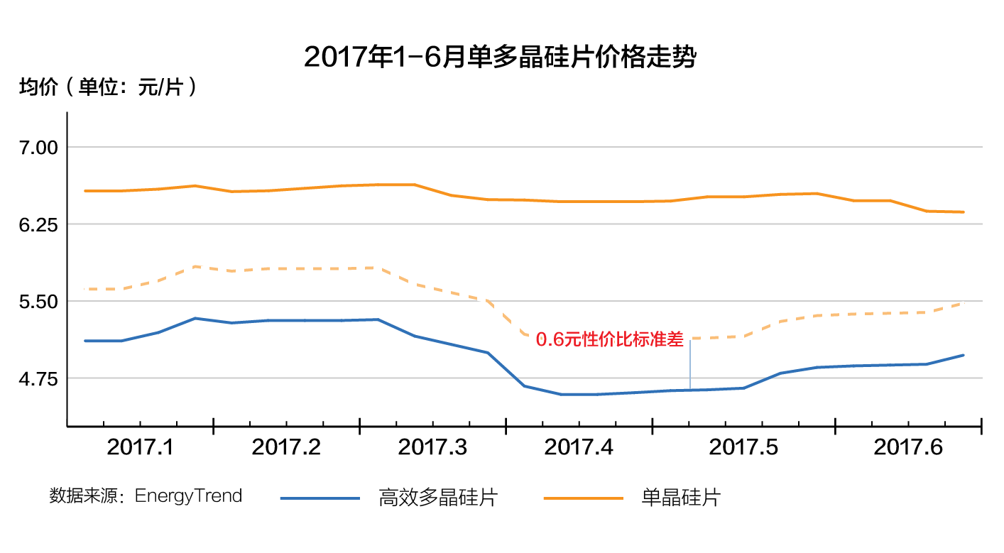 集邦新能源統(tǒng)計數(shù)據(jù)顯示,2017上半年光伏市場,從一季度的市場淡季到二季度的6.30搶裝,多晶硅片價格在4.5-5.3元/片之間,單晶硅片價格在6.3-6.5元/片之間,單晶幅度變動不大,一直處于高位。組件價格3元成為單多晶分水嶺,單晶組件價格3.1-3.2元/瓦,和多晶有0.2-0.3元/瓦的價差,而且產(chǎn)能不足一片難求,造成了包括“領(lǐng)跑者”項目在內(nèi)的眾多設(shè)計成單晶電站無法按期完工,錯失了6.30并網(wǎng)節(jié)點。