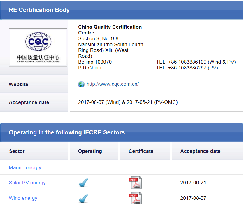 至此,CQC不僅是國(guó)內(nèi)首家取得中國(guó)合格評(píng)定國(guó)家認(rèn)可委員會(huì)(簡(jiǎn)稱CNAS)ISO/IEC 17020光伏和風(fēng)能檢驗(yàn)機(jī)構(gòu)雙認(rèn)可的機(jī)構(gòu),CQC及其分支機(jī)構(gòu)同時(shí)也是國(guó)際上獲得IECRE體系光伏、風(fēng)能兩大領(lǐng)域檢驗(yàn)、檢測(cè)和認(rèn)證所有資質(zhì)的第一批機(jī)構(gòu),已經(jīng)滿足開(kāi)展IECRE關(guān)于光伏系統(tǒng)認(rèn)證和風(fēng)電系統(tǒng)認(rèn)證的全部技術(shù)要求,CQC出具的認(rèn)證證書(shū)將會(huì)在IECRE多邊互認(rèn)體系中被承認(rèn),助力我國(guó)光伏和風(fēng)電企業(yè)“走出去”,在全球新能源市場(chǎng)繼續(xù)領(lǐng)跑。