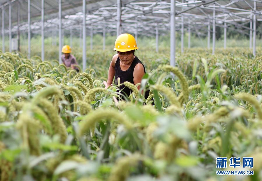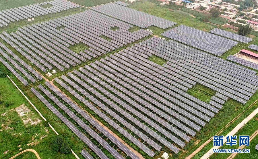 7月26日,農(nóng)民在任縣永福莊鄉(xiāng)農(nóng)光互補(bǔ)扶貧光伏發(fā)電場谷田里勞作。