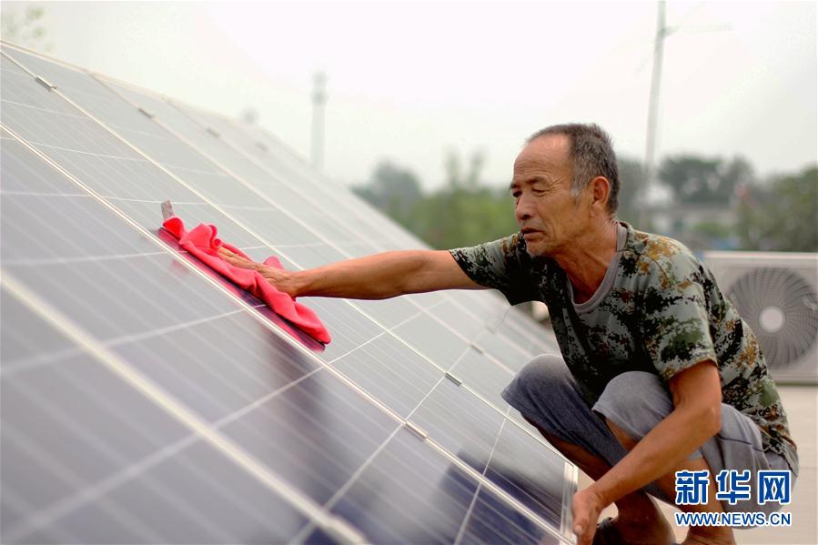 7月26日,河北省任縣西馬河橋村貧困戶孫仁倉在清理自家房頂分布式光伏板。
